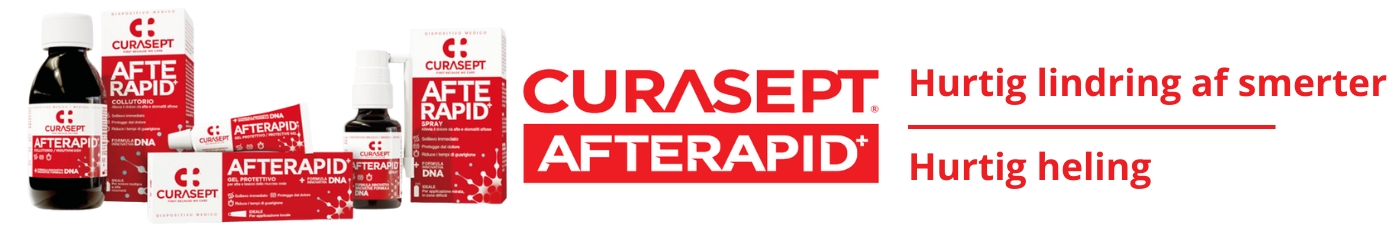 Curasept AfteRapid indeholder Hyaluronic Biomist® , som er patenteret og giver dybdegående, samt hurtig lindring og heling af sår, after, blister og blæner. Anvendes fra 6 års alderen i en uge 2-3 gange dagligt. Skyl ikke munden og drik ikke i mindst en time efter anvendelse.