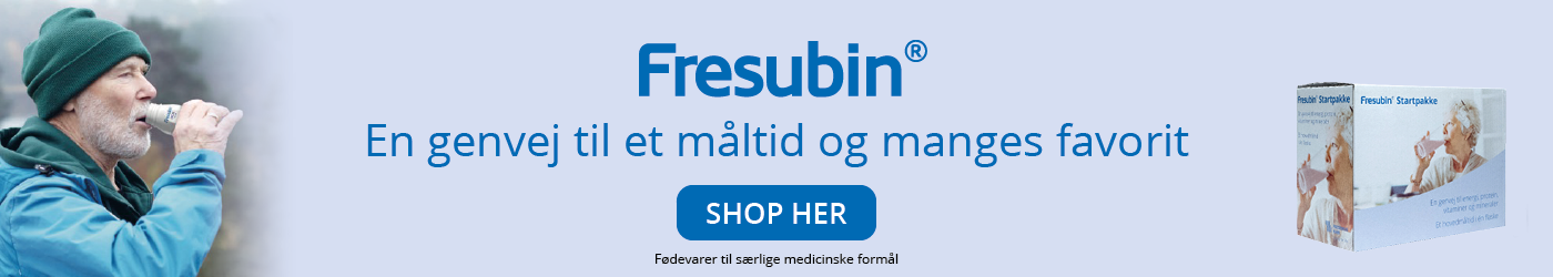Fresubin® er en række ernæringsprodukter til dig, der har brug for tilskud af energi og protein. De smager godt, og kombineret med motion opnås den bedste effekt. Alle produkterne er mælkebaserede, hvilket betyder, at du får proteiner af høj kvalitet. Derudover får du en stor mængde energi samt vitaminer og mineraler i afbalancerede mængder. Produkterne betegnes som fødevarer til særlige medicinske formål. Kan hjælpe dig i hverdagen til at holde vægten oppe.