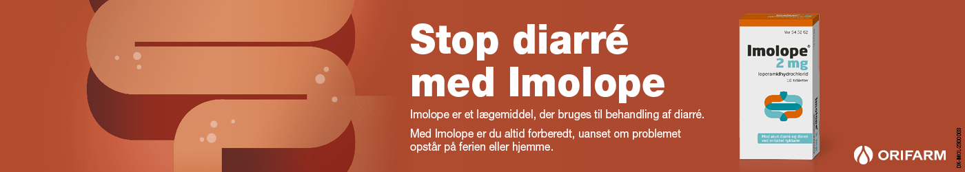 Imolope® er tabletter, du anvender mod akut opstået diarré. Imolope® virker ved at gøre madens passage gennem tarmene langsommere. Derved bliver tabet af væske og næringsstoffer i kroppen mindre, og du får lettere ved at optage vand og mineraler. Resultatet er en mere fast og mindre hyppig afføring.