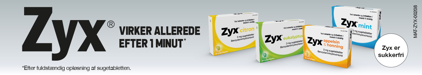 Zyx er en smertestillende sugetablet, der hjælper, når du har ondt i halsen. Zyx indeholder det aktive stof benzydamin, der med sin hurtigtvirkende og lokalbedøvende effekt virker smertestillende. Zyx virker også mod de symptomer, der er årsag til, at det gør ondt – nemlig rødme, hævelse og varmefornemmelse. Zyx kan også anvendes ved blister i munden.